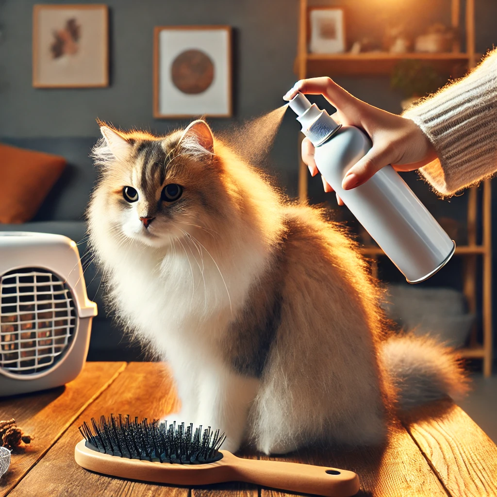 정전기 방지 스프레이, 고양이 전용 보습제 또는 알로에 수딩젤을 소량 사용해 빗질 전후 털을 정돈해주면 효과적입니다. 단, 제품 선택 시 반드시 고양이용으로 안전성이 검증된 제품을 사용해야 하며, 고양이가 혀로 핥을 수 있으니 무향, 무자극, 무독성 제품을 선택하는 것이 기본입니다.